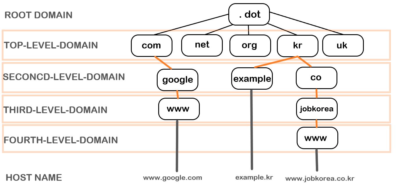 Root(또는 .dot), Top-Level-Domain, Second-Level-Domain, Third-Level-Domain 이루어져 있다.