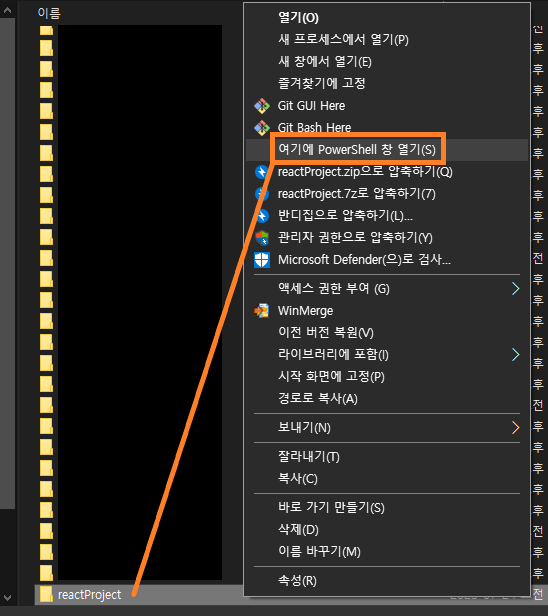 '여기에 PowerShell 창 열기' 가 보이는데,