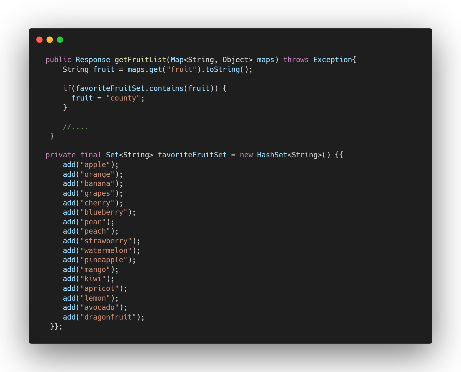 HashSet을 호출해서 contains를 이용해서 과일 여부 확인을 해주는 로직이다.