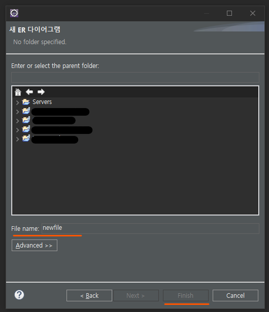 3. ERD를 생성하고 싶은 프로젝트 선택 > File name 설정 > Finish 버튼 클릭