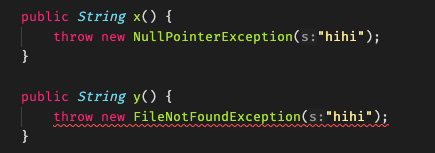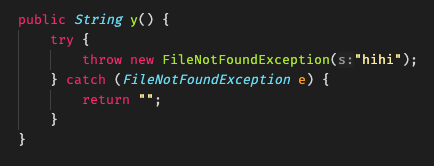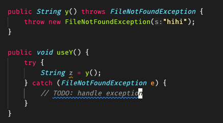 y()를 살펴보면 throws로 ‘나 Checked Exception인 FNFE를 던질게 쓰는 쪽에서 처리해’ 라고 선언했는데