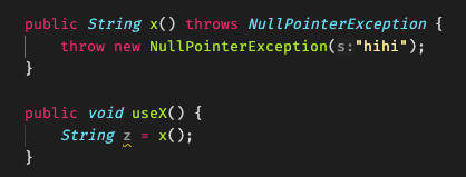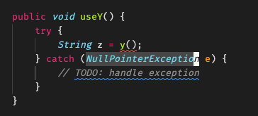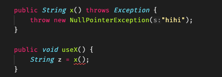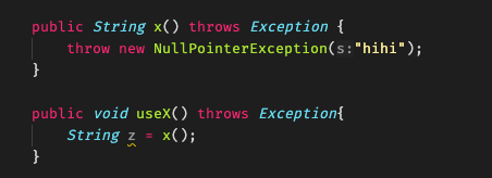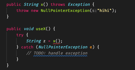 만약 이렇게 x()는 실제로는 NPE만 발생시키니까 useX()쪽에서 나는 NPE만 처리하고 싶은데...라고 해도