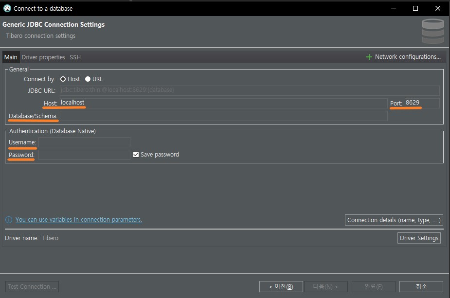 - Host (IP주소), Port, Database/Schema, Username, Password