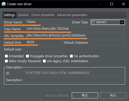 - URL Template : jdbc:tibero:thin:@{host}[:{port}]:{database}